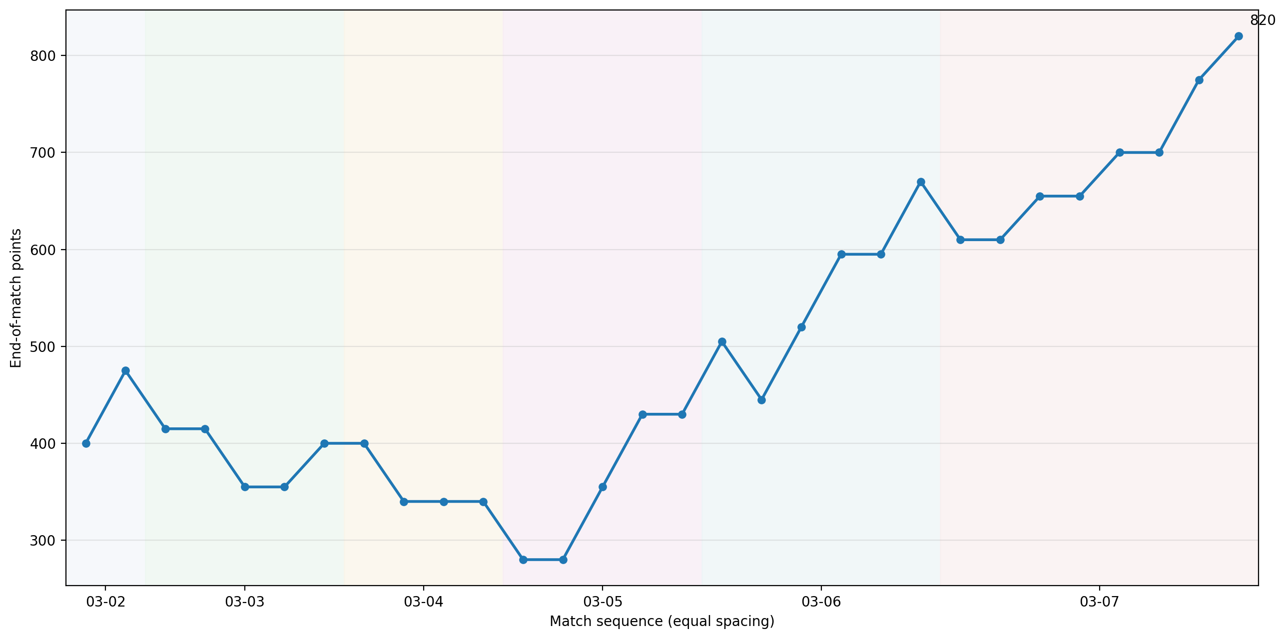 One particularly notable period was during the winter break of 2025, when I dropped back to 2-dan in sanma for the second time. I seriously considered giving up on the Tokujou goal. At that point, my yonma had just reached 3-dan for the first time—only about 600 points away from Tokujou. So I focused on yonma again. From January 19 to February 7, over 28 games, my score only went from 600 to 690 (peaking at 705).