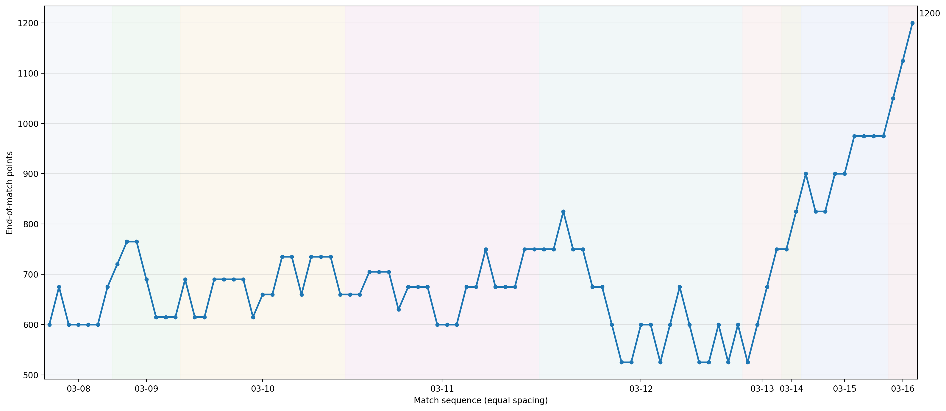 From the chart, starting around March 5, my score began to show a clear upward trend. In just three days, I reached 3-dan, setting a new personal best.